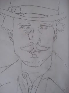 Since he's an actor, I had lots of photographs of him to choose from (thanks, Google images!). I went with a beautiful in-character western shot because I loved the graphic quality to his distinctive facial hair. Starting with a drawing from the photograph, I blocked out the main shapes: